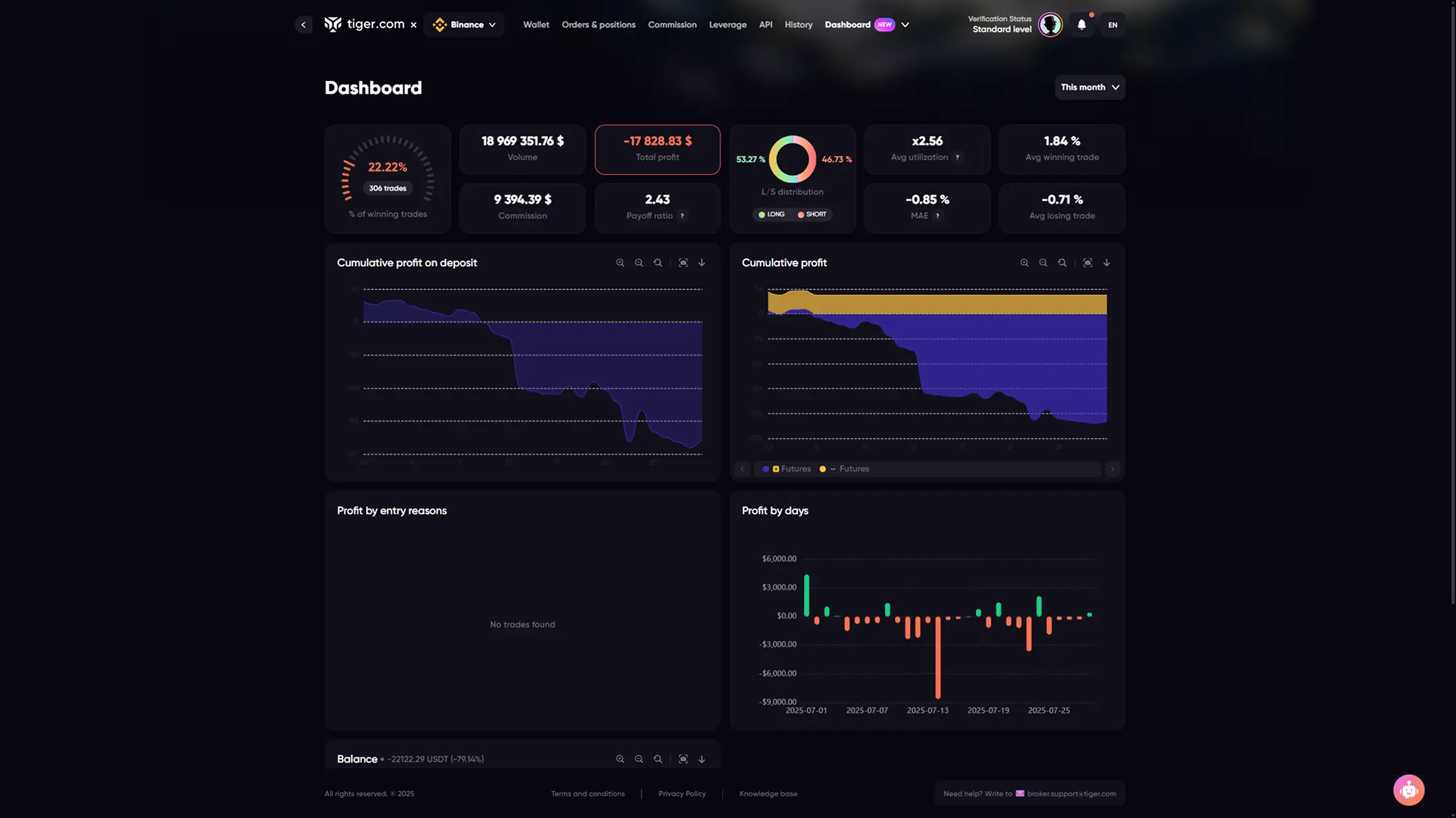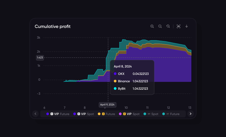 calculated using the same formula as Cumulative profit on deposit, but it displays trading results separately by exchange and market type.