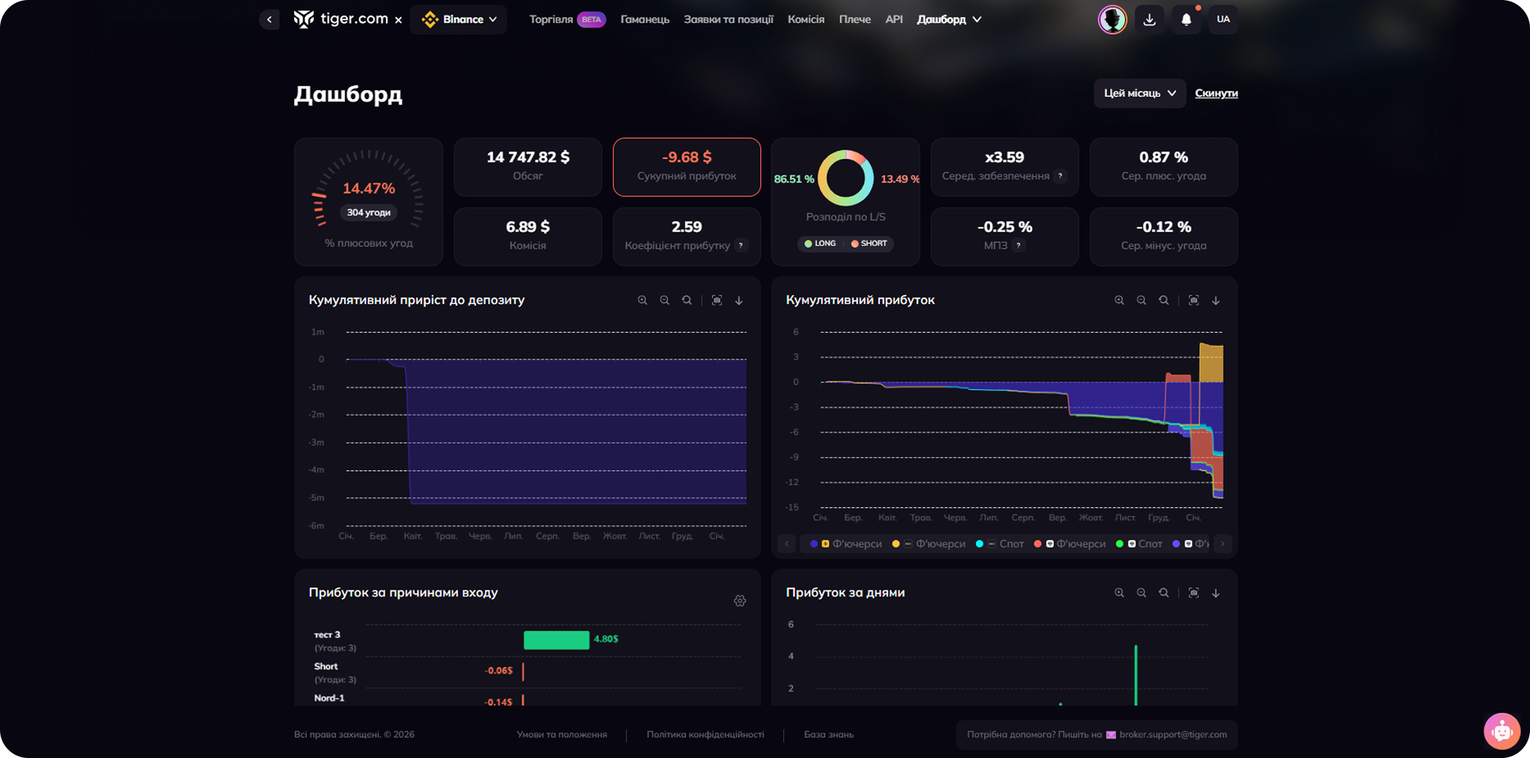 - Співвідношення Long/Short, середній PnL